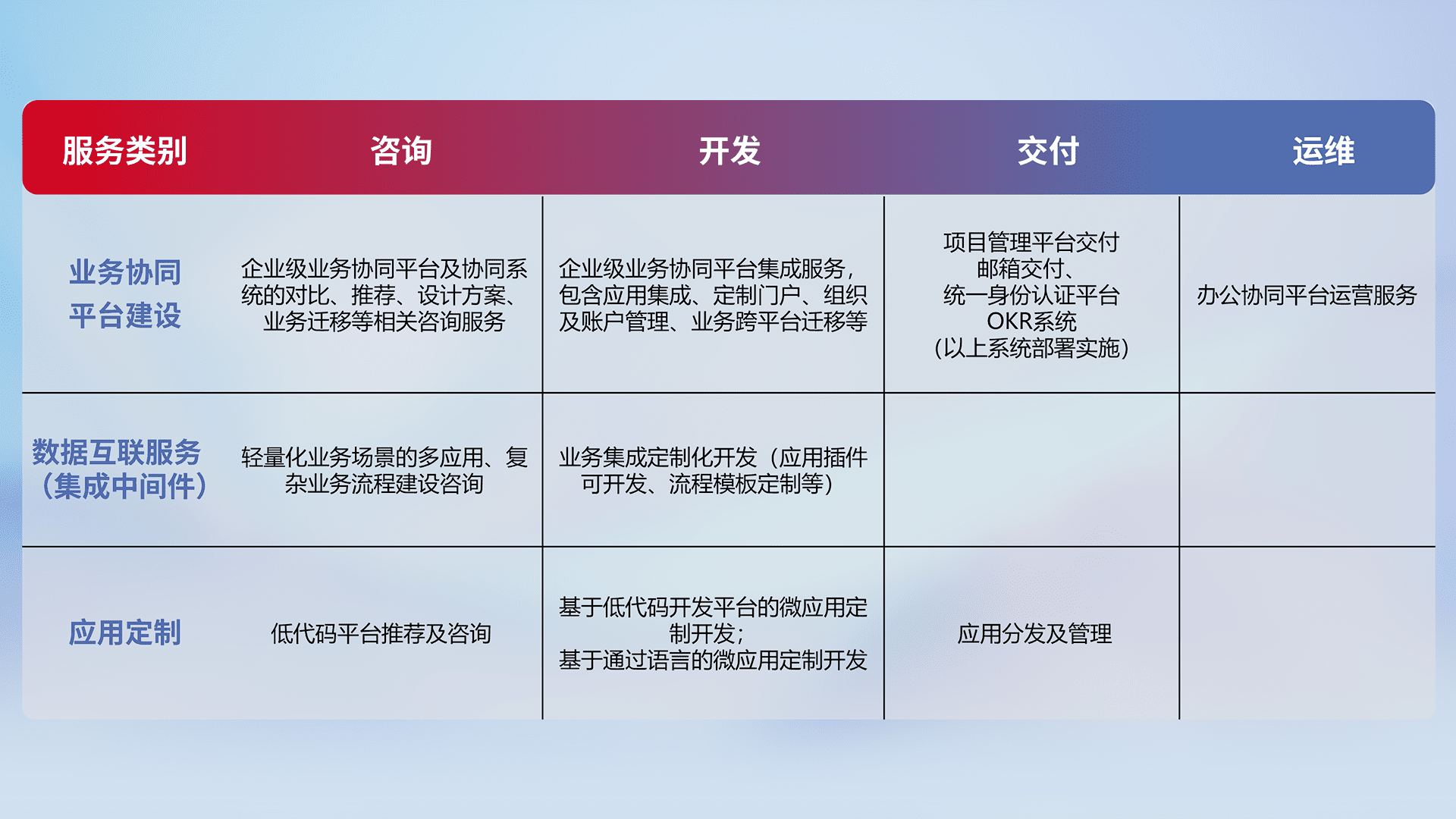 针对钉钉、、、企微、、、IDaas等平台级产品提供产品的规划、、方案、、、、交付、、定制化开发等服务,,,,实现如统一协同办公、、、智能客户服务、、、、混合会议管理、、智能数据查询、、、等业务场景,,实现数字化转型。。。