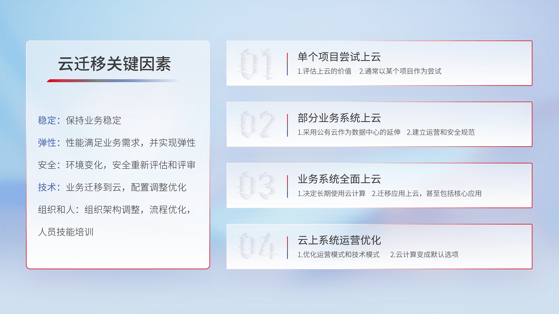 结合实际业务,,从规划设计、、云平台选型、、、、云原生改造、、数据迁移、、集成交付,,,迁移全过程为客户识别最佳上云路径,,,,做好风险识别管理,,,,设计网络架构、、身份权限、、、安全审计合规、、、、操作审计、、日志审计、、监控告警策略、、、、多站点容灾设计等,,对云上基础设施进行整体规划,,,,提升IT治理水平,,,,以满足弹性、、、高可用、、、、高性能的需求。。。