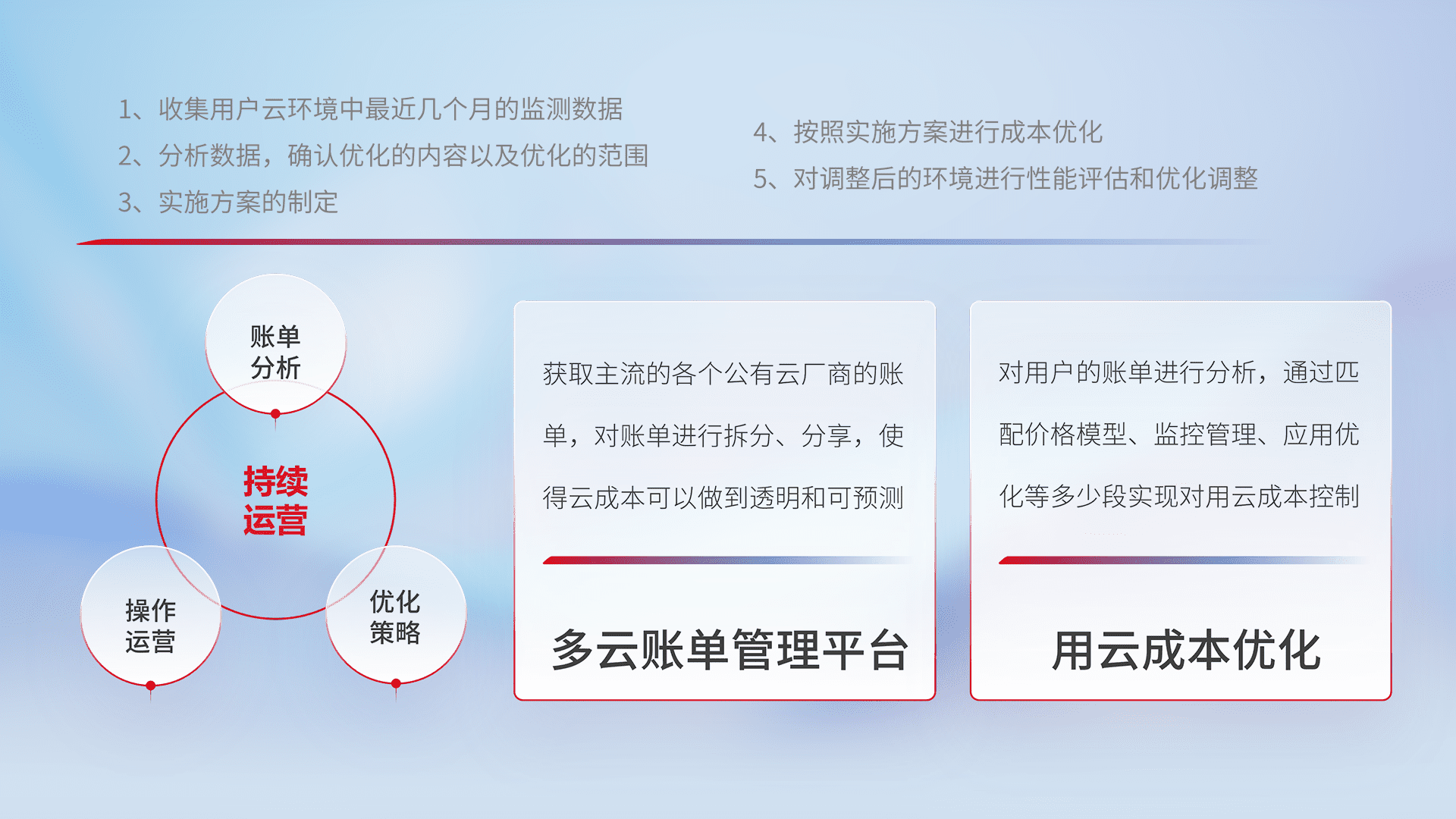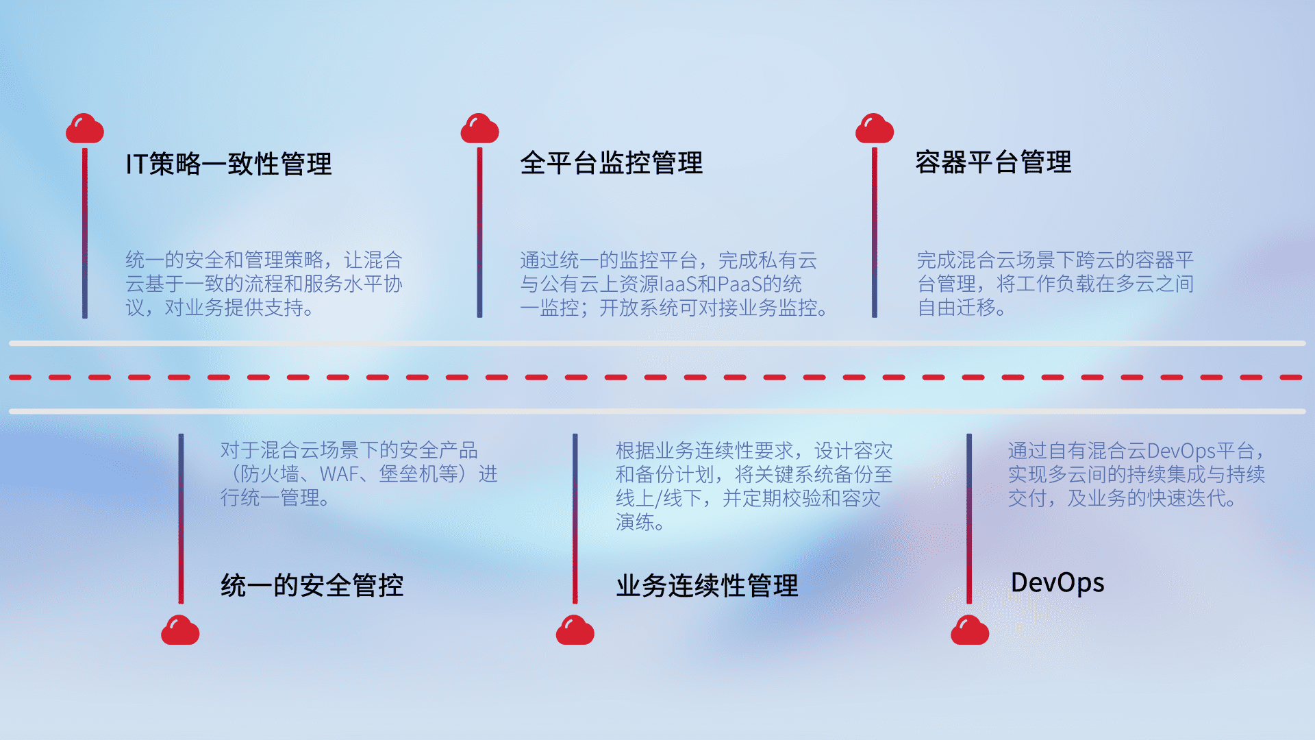 通过多云纳管,,以统一的资源数据模型把客户的云资源进行抽象和封装,,,进而实现对多云资源的统一操作,,,,保障云资源管理的可靠性、、、、稳定性与可用性。。。。量身定制化运维内容,,,配置、、、开发运维、、补丁管理、、、、备份、、监控、、认证和访问管理、、、审计和日常巡检等,,,,保障在用云过程中的可靠度,,稳定度以及高可用率。。